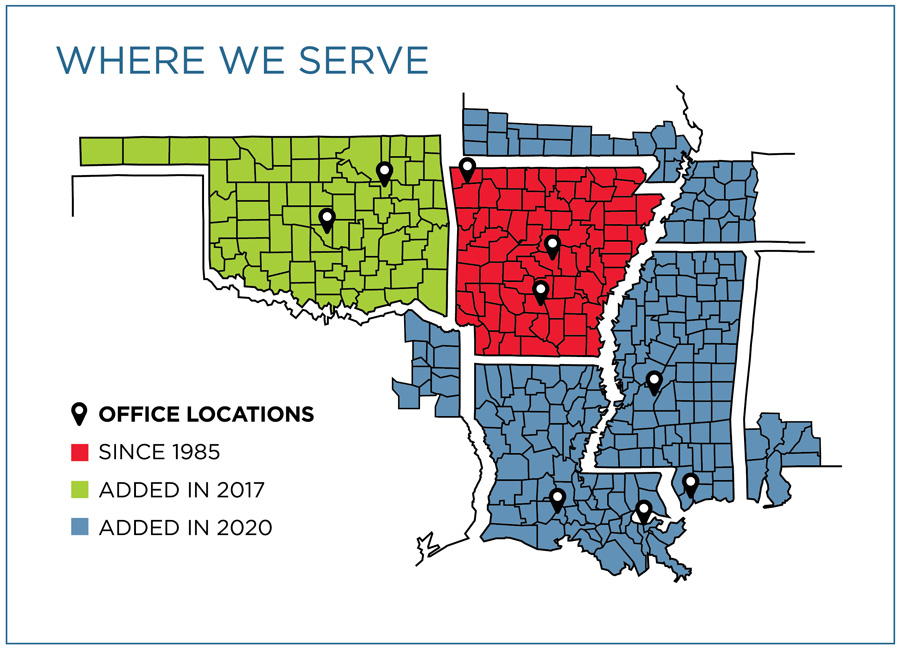 Headquartered in North Little Rock, Powers has offices throughout the state of Arkansas, along with staff covering every county. We also have regional offices in Oklahoma, Mississippi, and Louisiana.